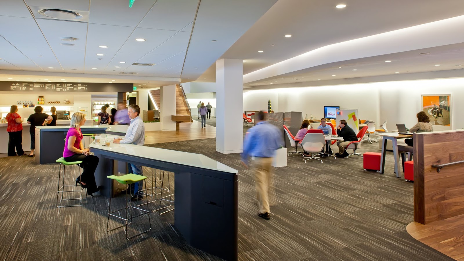 A WorkCafe is a dynamic space that connects people with colleagues, their work, and their organization. It transforms traditional corporate cafeteria real estate into destinations for connection, collaboration, focus and innovation.