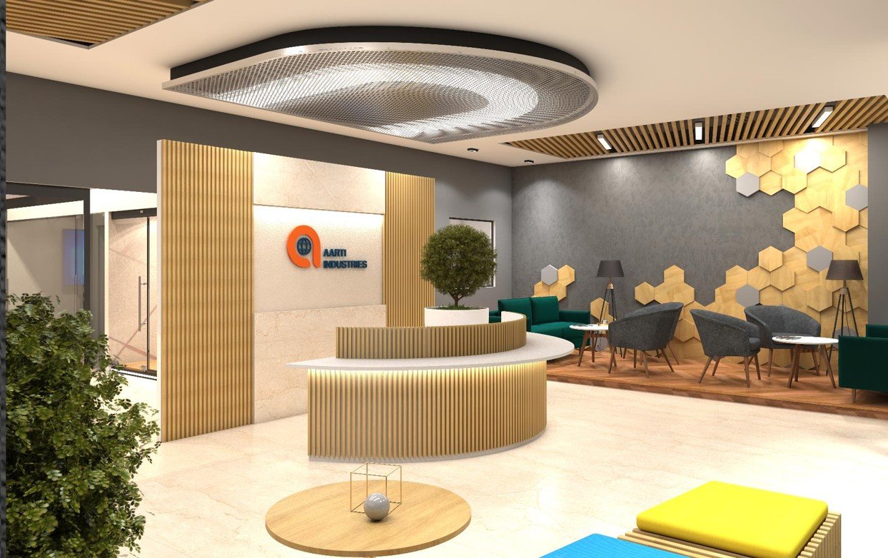 Dreamspace delivered multiple corporate workplaces for Aarti Industries, creating a multi-storeyed Build-to-Suit campus that blends functionality, brand identity, and employee well-being into a future-ready environment.